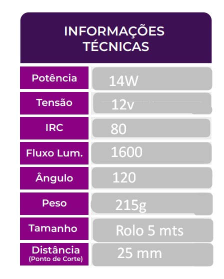 Potência – 14w metro – tensão 12v  ( obrigatório uso de drive, vendido separadamente)
