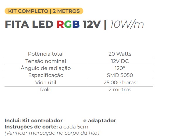 256475 – FITA LED RGB 10W/M 12V C/FONTE/CONTR.2M ( produto completo, incluso 2 metros fita, 1 driver 12v e 1 controle infra)