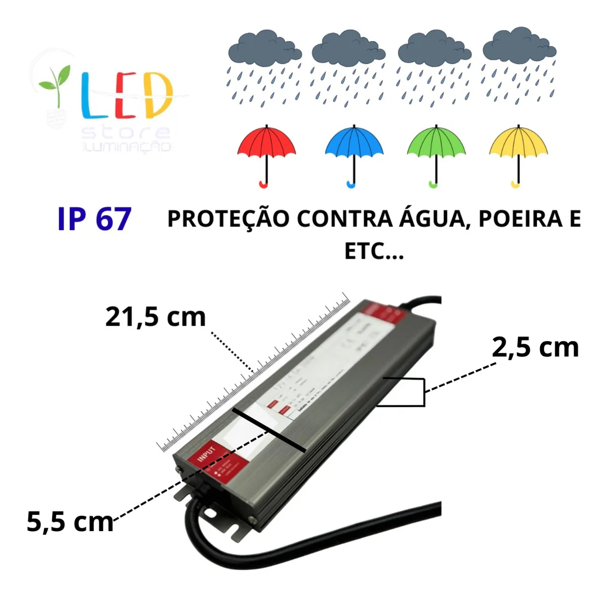 Os Drives com indice de proteção IP67 são projetados para ambientes externos ou úmidos, sendo totalmente protegida contra poeira (o ‘6’ no IP67) e capaz de suportar imersão temporária em água (o ‘7’). Esses drivers são selados, geralmente em caixas de alumínio, para garantir durabilidade e segurança em instalações como fitas de LED em jardins, fachadas ou áreas de piscina, oferecendo confiabilidade e eficiência. (eles são necessários para instalação das Fitas de led 12V e 24v), eles servem para transformar a energia da rede com tensão 127 ou 220v em corrente de 12v ou 24v.
